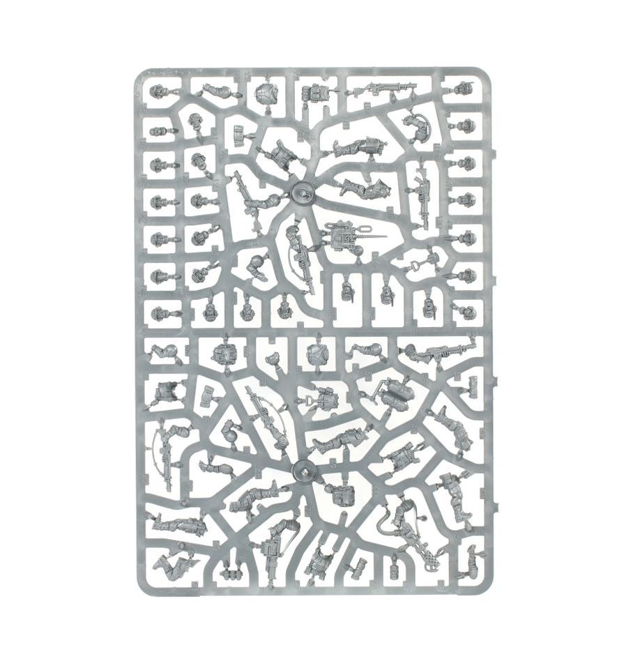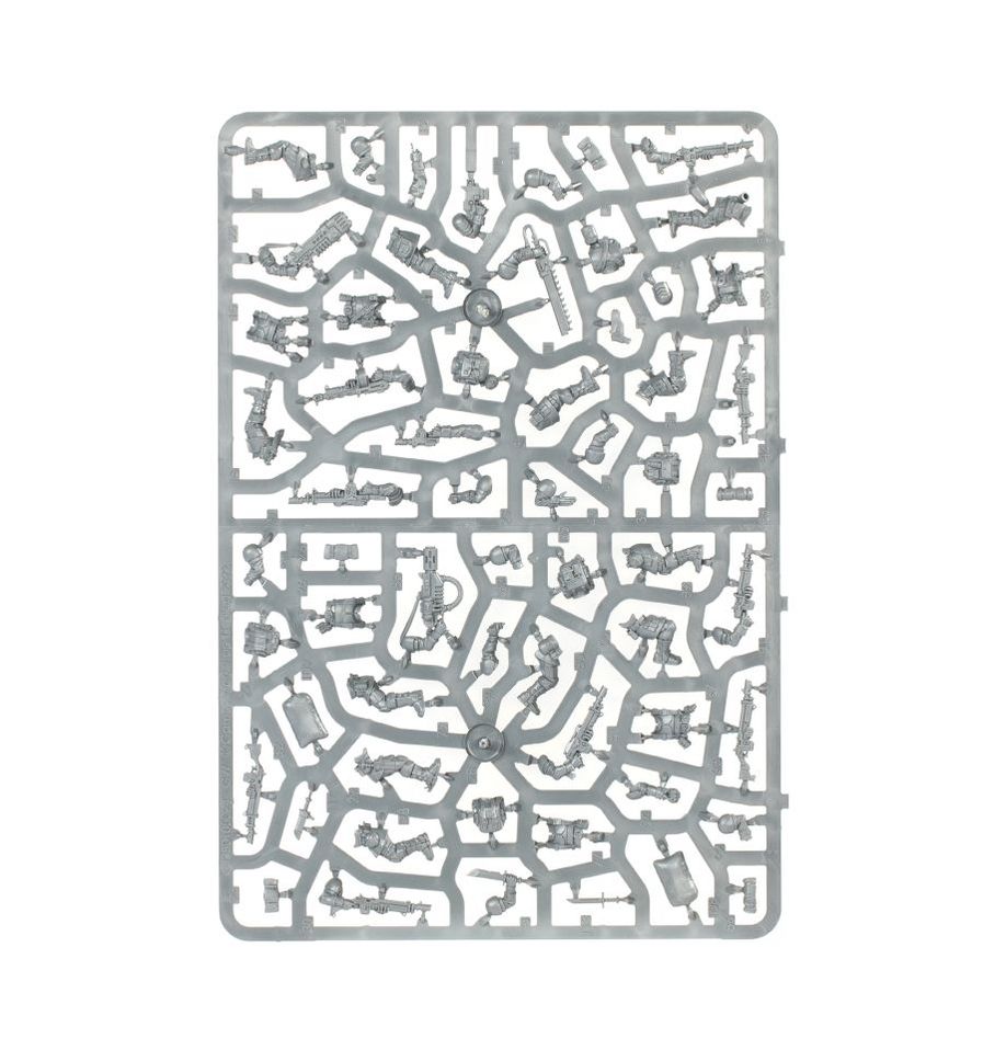 This kit comprises 131 plastic components, and is supplied with 10x Citadel 25mm Round Bases. Also included is a Cadian Infantry Transfer Sheet, with 597 transfers featuring numerals, squad markings, and Cadian regimental heraldry. These miniatures are supplied unpainted and require assembly.