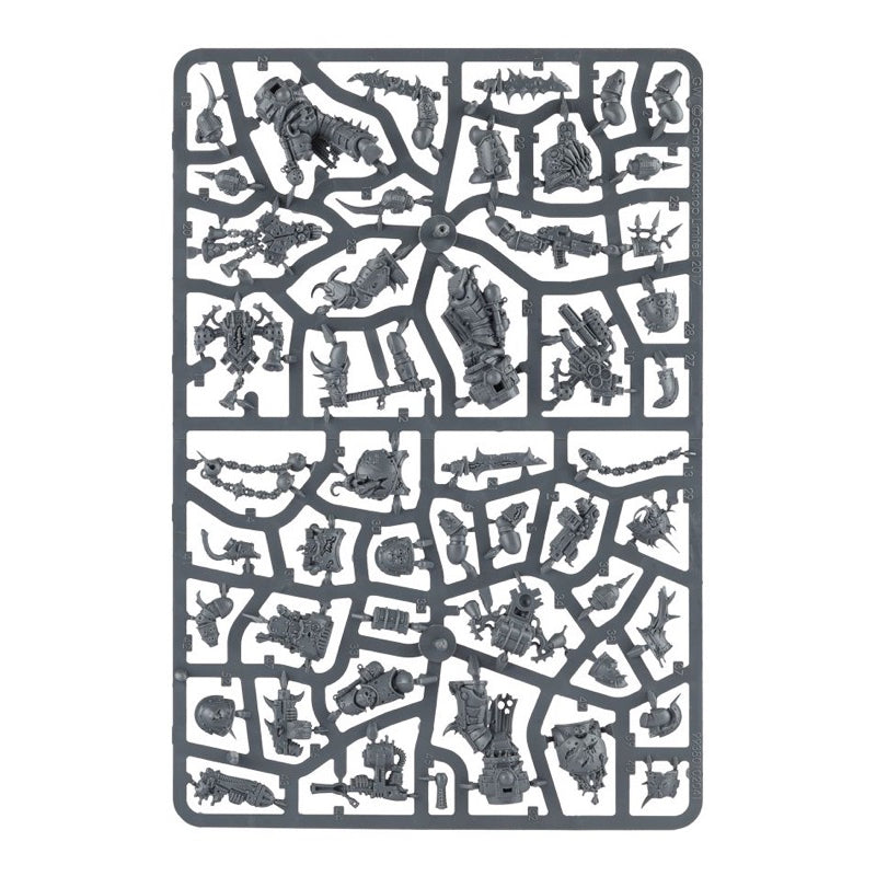 These models feature a wide range of weapons and heads, many of which are designed to fit a specific model – there are 8 boltguns, 4 plague knives, 2 bubotic axes, a blight launcher, a plasma gun, a meltagun, a plaguebelcher, a heavy plaguespewer (with backpack), a mace of contagion, a great plague cleaver, a plague flail, a plasma pistol and a bolt pistol. There are 2 weapon options available for the unit Champion: a specific plaguesword and power fist, and there are a total of 16 bare and helmeted heads. 2 specific arms are included for a model holding a blight grenade, with one hand pulling the pin.