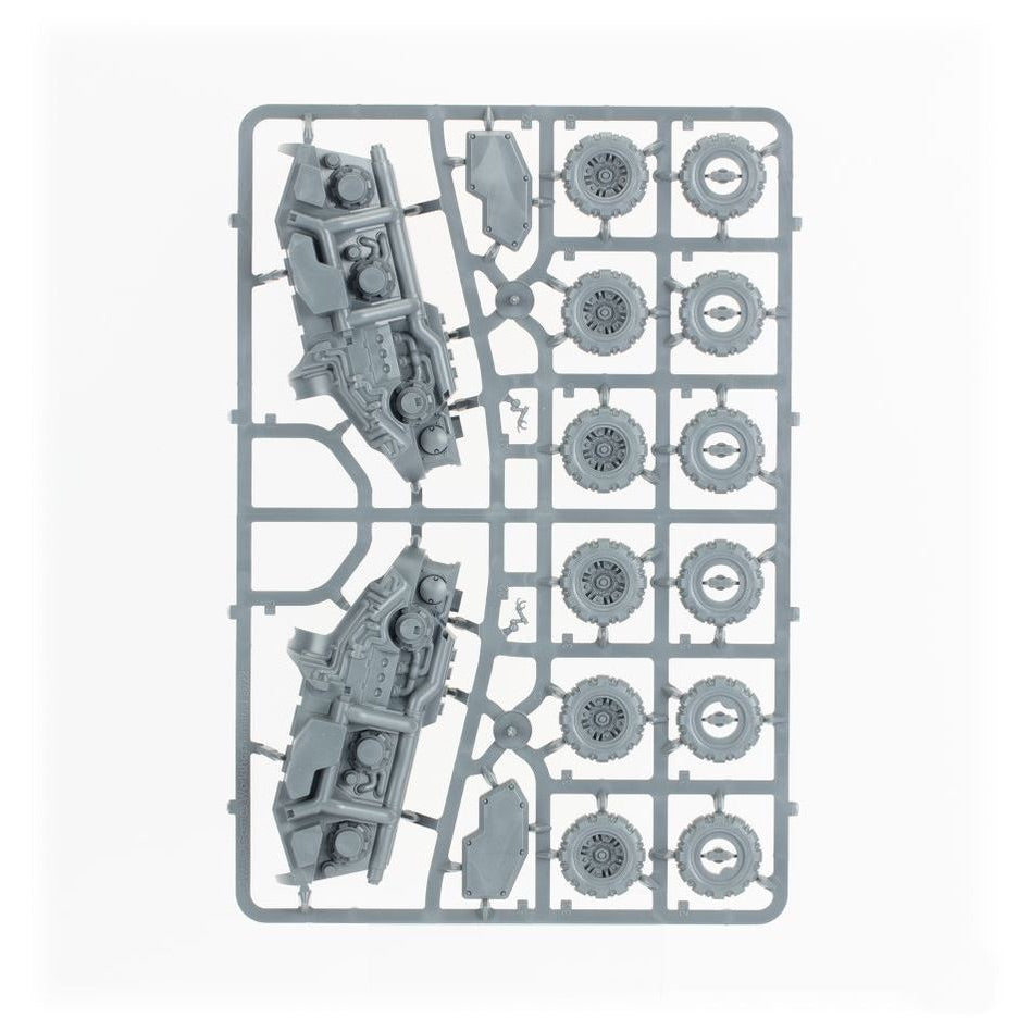 This box builds one Sagitaur, a fast-moving vehicle that combines firepower with the ability to carry a unit into battle. This sturdy six-wheeled vehicle boasts a hull-mounted twin bolt cannon, a rear transport hatch, and comes with a choice of four turret weapons operated by a robotic gunner – a HYLas beam cannon, L7 missile launcher, Sagitaur missile launcher, or MATR autocannon – providing the versatility to take on any threat. The Sagitaur's pilot is visible beneath a screen of clear plastic, with a choice of three different heads to customise your driver and keep each of your vehicles distinct.