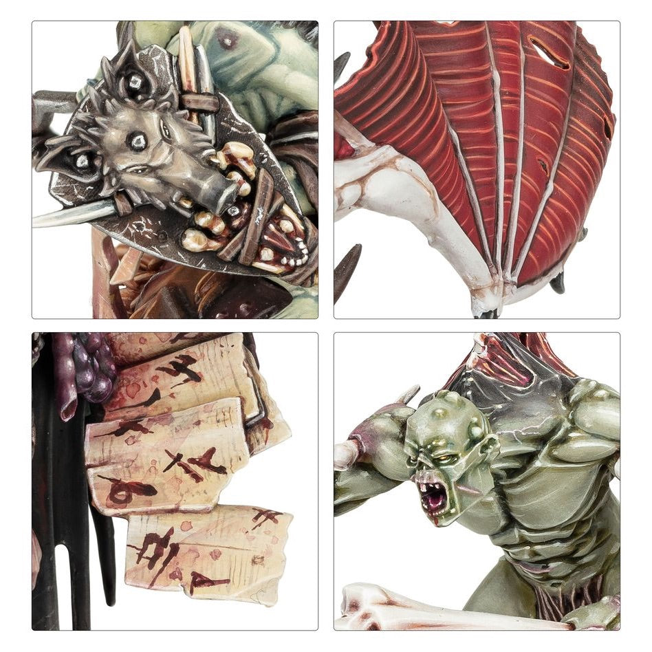 This gruesome battleforce is led by Grand Justice Gormayne, a grim orator who whips up his fellow cursed courtiers into a monstrous and macabre furore. His ghoulish force consists of swift and shrieking Morbheg Knights, brutal Crypt Horrors, and a unit of eager Cryptguard – all advancing to the thump of human-hide drums, beneath pennants of flayed flesh.