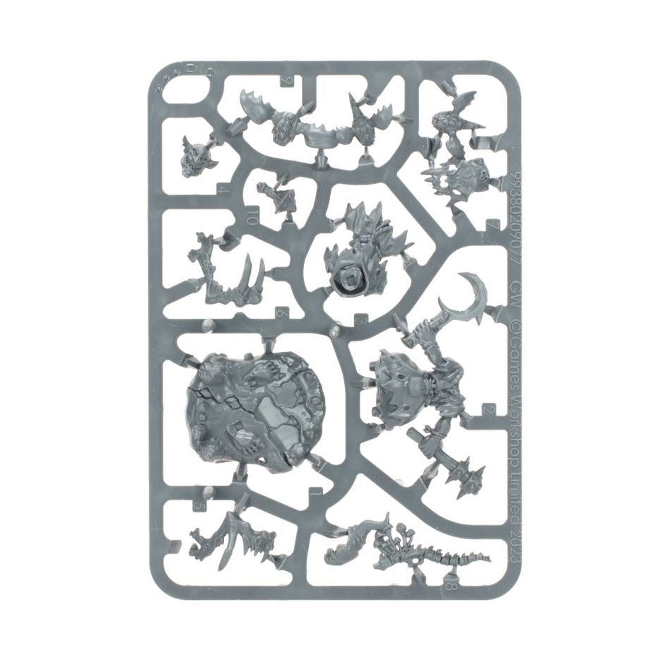 This multipart plastic kit builds a Rabble-Rowza, a Moonclan demagogue for the Gloomspite Gitz. Protected by his fearsome squig-skull armour, this noisy leader whips cave-dwelling monsters into a frothing frenzy. Should any foes get too close, the Rabble-Rowza lashes out with a moon-sickle and basha, whilst their screeching flock of mushroom-stuffed bat squigs dive-bomb enemies in explosive fashion.