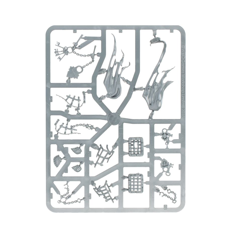 The miniatures in this box are easy to customise. The Spirit Torment has a choice of three heads, and the Chainghasts have four different masks to choose from. They also have optional cosmetic details for their bases, including chains, grates, and more.